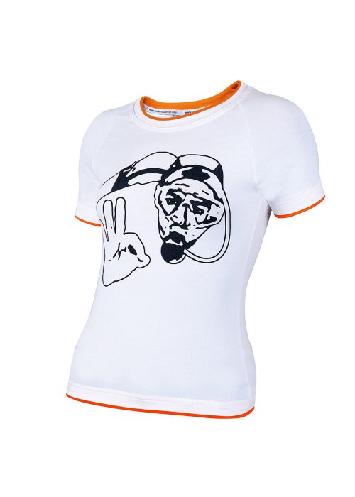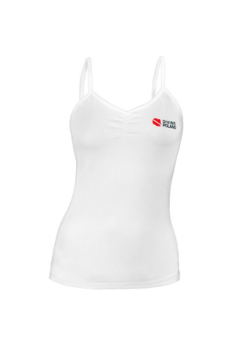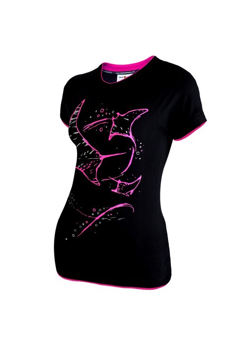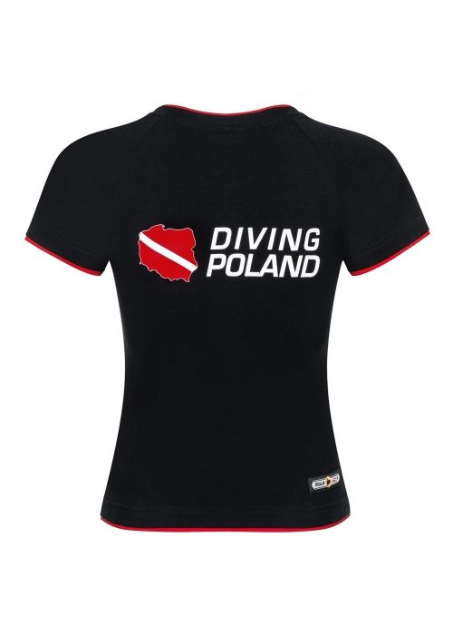 Wysokiej jakości t-shirt damski z krótkim rękawem typu reglan, wykończony kontrastowymi lamówkami przy ściągaczu, rękawach i na dole koszulki. Zaprojektowany w ciekawym, sportowym stylu. Doskonale skrojony, świetnie się układa. Dodatek elastanu sprawia, że t-shirt idealnie dopasuje się do ciała i podkreśla damską sylwetkę. Wygodny i praktyczny, idealny na co dzień dla wszystkich, dla których nurkowanie to pasja i styl życia.