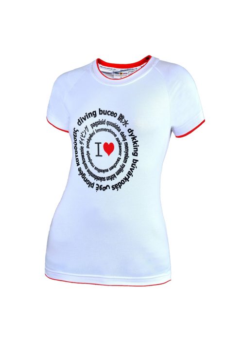 Wysokiej jakości t-shirt damski z krótkim rękawem typu reglan, wykończony kontrastowymi lamówkami przy ściągaczu, rękawach i na dole koszulki. Zaprojektowany w ciekawym, sportowym stylu. Doskonale skrojony, świetnie się układa. Dodatek elastanu sprawia, że t-shirt idealnie dopasuje się do ciała i podkreśla damską sylwetkę. Wygodny i praktyczny, idealny na co dzień dla wszystkich, dla których nurkowanie to pasja i styl życia.